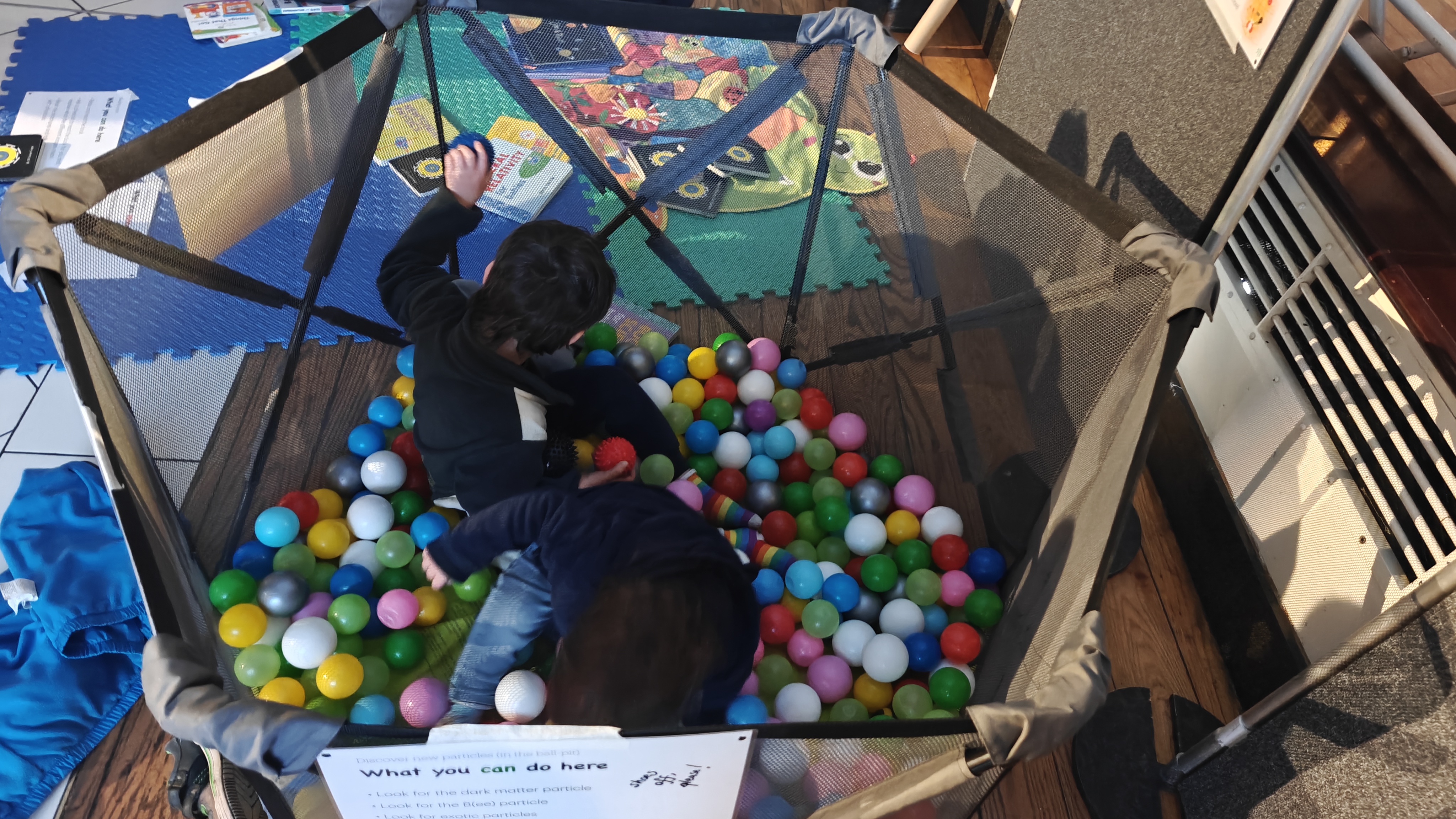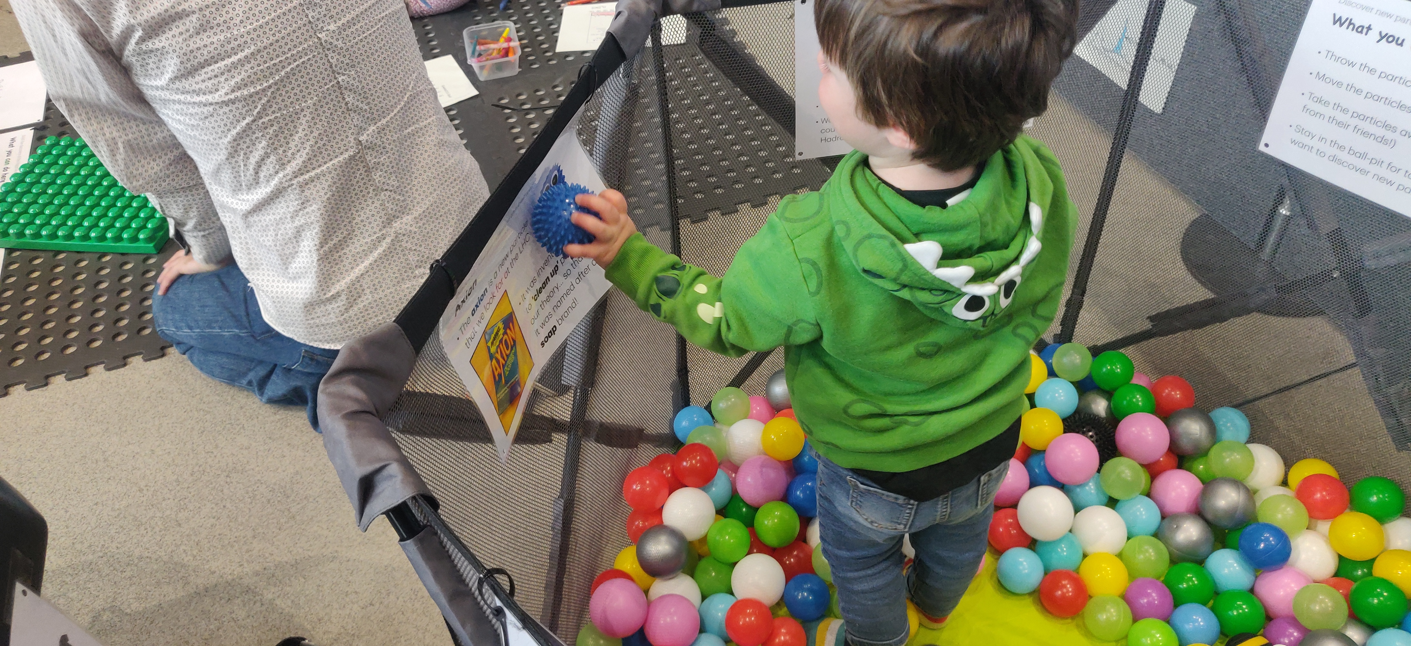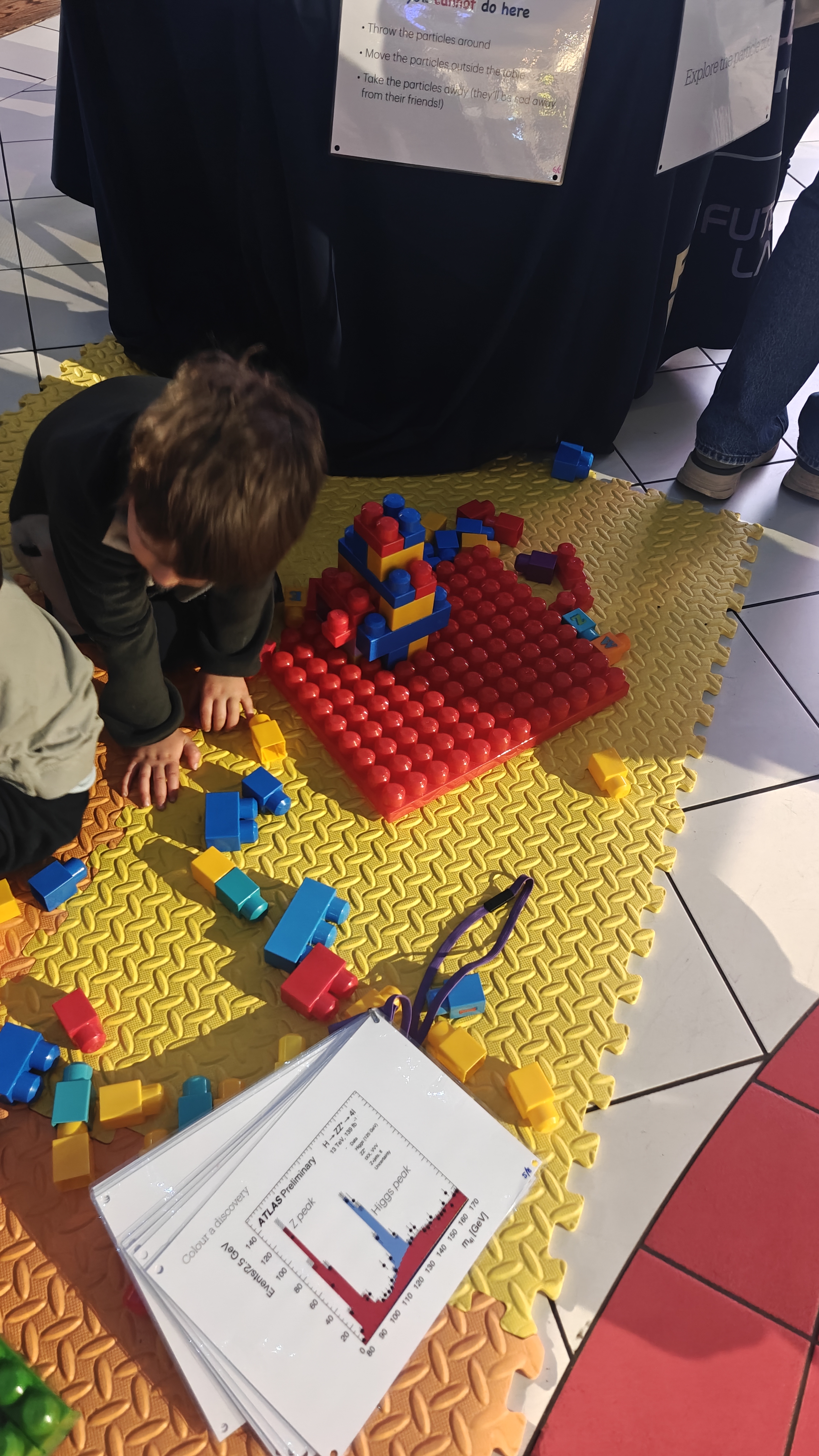 - Engagement: Scientists talk to parents while children play with particle physics-themed material.